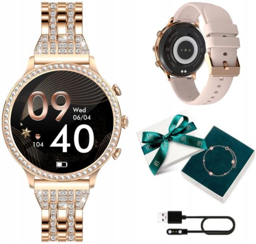 Elegancka metalowa obudową, która dodatkowo jest zdobiona pięknymi cyrkoniami. To połączenie metalowej trwałości z blaskiem kamieni nadaje zegarkowi wyjątkowy, luksusowy charakter, idealny na wieczorne wyjścia i specjalne okazje. Metalowa obudowa w połączeniu z cyrkoniami tworzy wyjątkowy, modny akcent, który sprawia, że ten smartwatch to nie tylko narzędzie, ale również piękny dodatek do stylizacji każdej kobiety.
