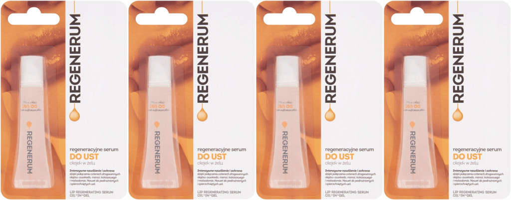 Regenerum dzięki lekkiej, żelowej konsystencji, długo pozostaje na ustach, nadając im lśniący blask. Praktyczne i łatwe w użyciu opakowanie pozwala na precyzyjną aplikację produktu, bezpośrednio na powierzchnie ust.