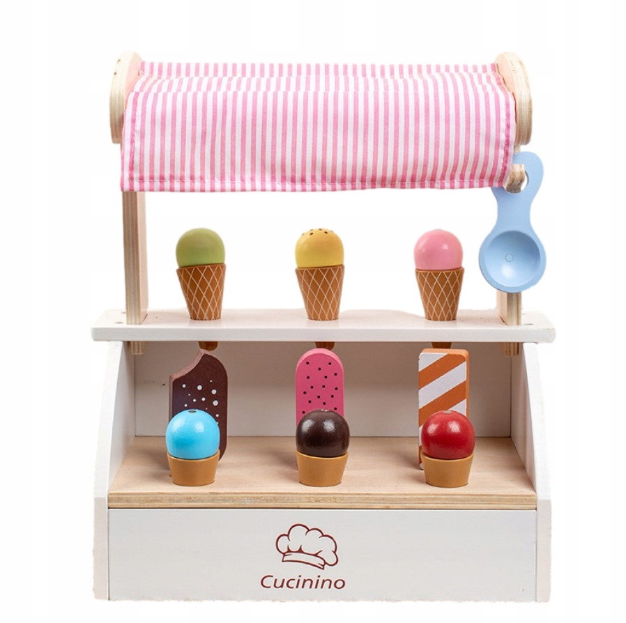 Drewniana Lodziarnia rozkocha w sobie nie jednego malucha! Estetyczne wykonanie, pastelowe kolory i dużo elementów sprawi, że Twoje dziecko będzie godzinami tworzyć przepyszne kombinacje lodowych przysmaków. Zestaw idealnie sprawdzi się podczas zabawy z koleżankami, lalami czy misiami. Dzięki zastosowaniu magnesów, kompozycje smakowe są bezpieczne i stabilne. Ponadto, uroczy, minimalistyczny stojak na lody z materiałowym daszkiem, pięknie je wyeksponuje i ułatwi ciężki wybór ulubionego smaku lodów stworzonych przez Twoją pociechę. Produkt został zaprojektowany tak, aby urzekał swoim wyglądem, ale również był idealnym produktem dla rodziców ceniących w zabawkach praktyczne zastosowanie.