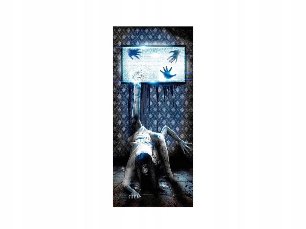 Ta dekoracja to doskonały sposób na wprowadzenie niepokojącej i tajemniczej atmosfery w przestrzeni. Przedstawia ona realistyczną scenę, gdzie na ścianie znajduje się telewizor, a z niego wyłania się przerażająca postać, wzbudzając strach i dreszcz emocji.