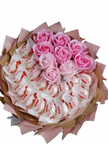 Wyjątkowy bukiet, który łączy w sobie 17 pralinek Raffaello oraz 9 mydlanych róż w subtelnych odcieniach różu. Całość utrzymana jest w eleganckiej biało-złoto-różowej kolorystyce, tworząc harmonijną i stylową kompozycję.