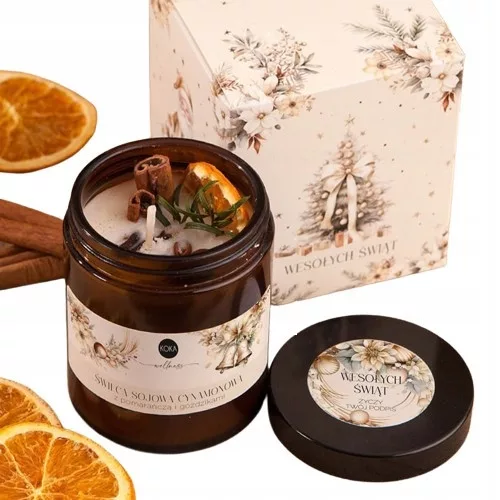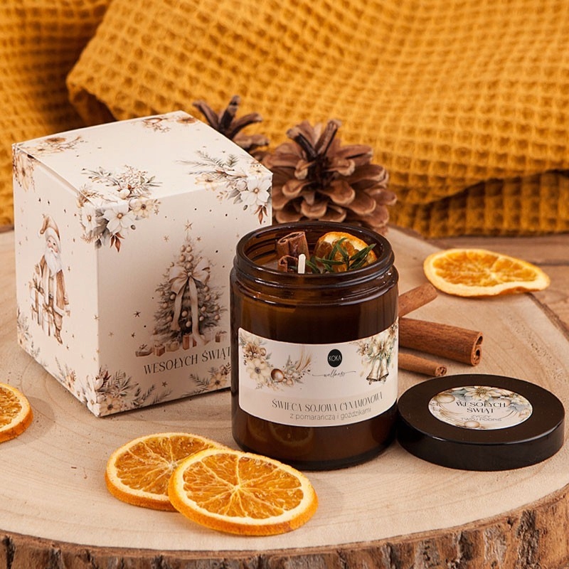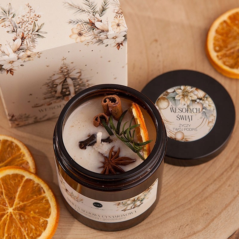 • skład: naturalna ręcznie robiona świeca sojowa zamknięta w szklanym słoiczku w brązowym kolorze i z dopasowaną nakrętką, świeca posiada wspaniały aromat cynamonu oraz zatopione plasterki pomarańczy, gałązki cisu, cynamon i goździki; na słoiczku znajduje się specjalna naklejka z dopasowaną grafiką oraz nazwą świecy; wysoka jakość świec - 100% handmade, wyprodukowane w Polsce z naturalnego wosku sojowego i naturalnych olejków eterycznych; słoik posiada na wieczku naklejkę z życzeniami oraz spersonalizowanym podpisem, sprzedawany w komplecie w ozdobnym kartoniku ze świątecznym motywem