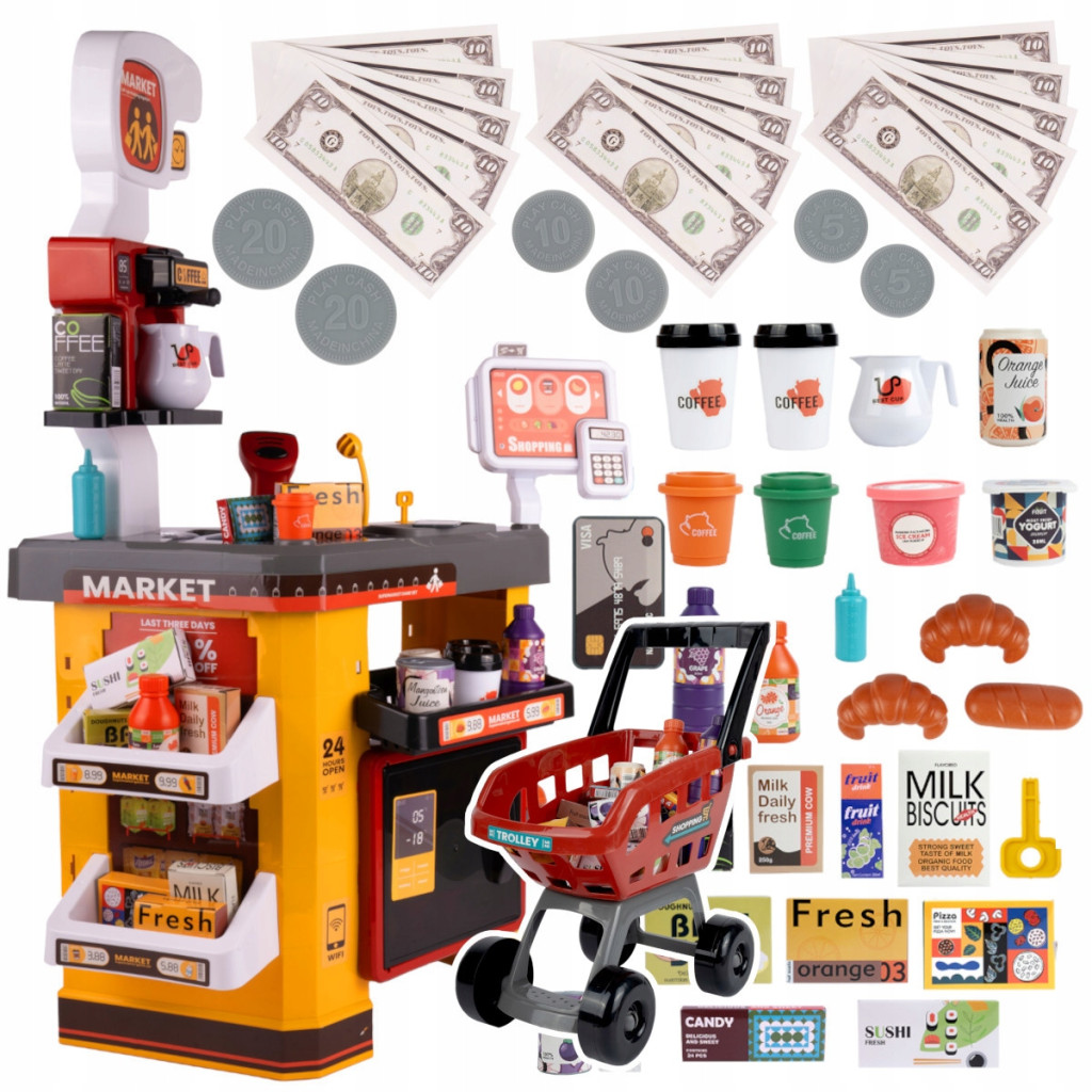 Nasz najnowszy zestaw to spełnienie marzeń każdego dziecka lubiącego zabawy w sklep i marzącego by zostać handlowcem. Rozbudowany supermarket to także mini kawiarenka z ekspresem do kawy oraz interaktywną lodówką posiadającą efekt zamglenia. Dodatkowo lodówka posiada wbudowane oświetlenie, dzięki czemu jest jeszcze bardziej realistyczna.