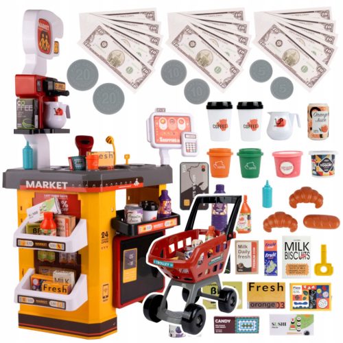 Sklep supermarket z dużą ilością akcesoriów na pewno zachwyci każdego małego sprzedawcę. Zestaw został wykonany w całości z plastiku w czerwono-żółtej kolorystyce.