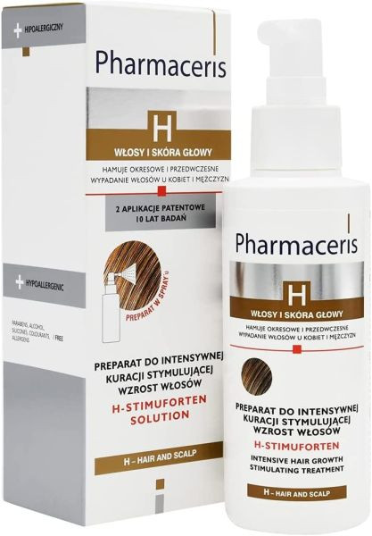 Pharmaceris H Stimuforten to specjalistyczny preparat z kompleksem Naturalny Czynnik Wzrostu FGF i kofeina. Wspomniany kompleks został zgłoszony do opatentowania. Pomaga on przeciwdziałać łysieniu fizjologicznemu, androgenowemu i telogenowemu. Kompleks Naturalny Czynnik Wzrostu FGF pobudza komórki mieszków włosowych do podziału, a także przyspiesza proces powstawania nowych włosów. Przenika w głąb mieszka włosowego. Działa na poziomie komórkowym, aktywując geny odpowiadające za proces budowy nowego włosa.