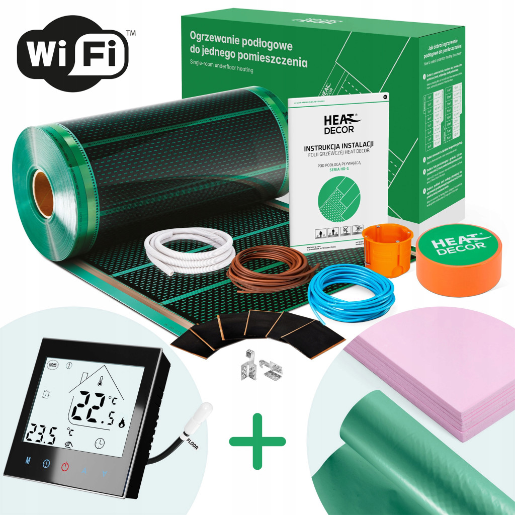 1. Folia grzewcza Heat Decor seria HD-G, moc 140 W/m², szerokość pasa 50 cm, powierzchna 17,5 m², gwarancja 10 lat.