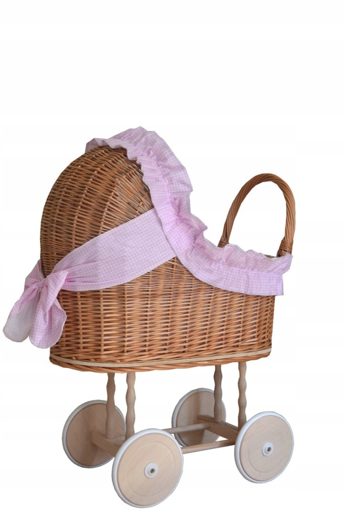 Śliczny i solidny wiklinowy wózek dla lalek z oryginalną kokardą i falbanką w różową krateczkę.