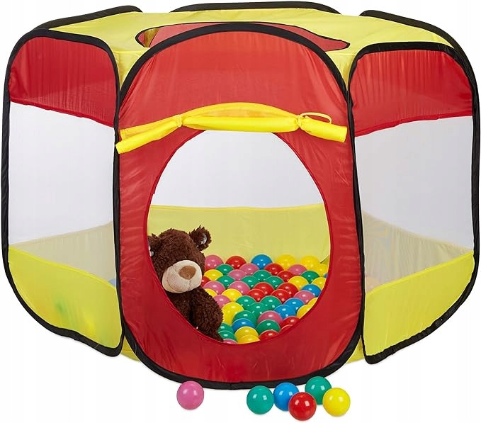 • Kolorowe kule: Namiot jest utrzymany w wesołych kolorach, a w zestawie znajduje się aż 100 kolorowych kul o średnicy 5 cm, które dodają uroku i atrakcyjności.