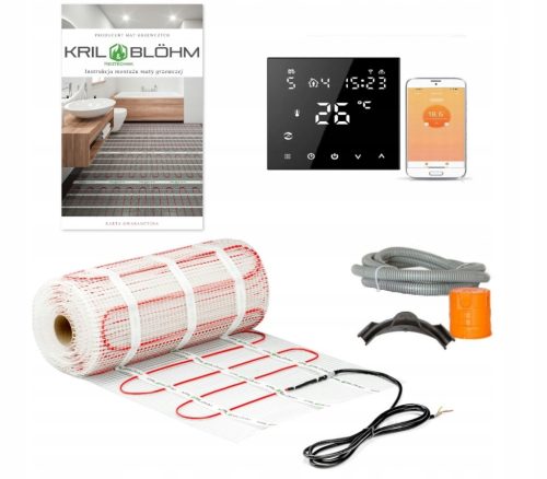Czerpiąc z wieloletniego doświadczenia Kril&Blohm, Holenderskiego producenta ekologicznych systemów grzewczych,  niniejszym oferujemy Państwu gotowy zestaw montażowy z matą grzewczą 150W/m2 KRIL&BLÖHM model: AFVAL 5m2 + Regulator temperatury H607 WiFi Czarny