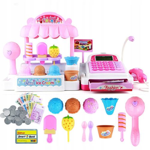 Zestaw KASA/SKLEP-LODZIARANIA to długie zabawy pełne edukacji i radości dla Twojego dziecka. Sklep z lodami dysponuje szerokim wyborem produktów, a dołączona kasa to pełnofunkcyjne urządzenie. Kalkulator, czytnik kart, skaner, mikrofon, karty kredytowe, gotówka i wiele innych - to wszystko pozwoli dzieciom wcielić się w role klientów i sprzedawców. Zabawa i nauka mogą być wesołe!