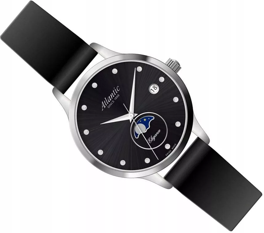 Damski zegarek Atlantic 29040.41.67L to elegancki i szykowny model z kolekcji Elegance Moonphase szwajcarskiego producenta. Wyposażony w dokładny, szwajcarski mechanizm kwarcowy ETA F05.841.H1. Czarną tarczę, zdobioną szlifem słonecznym pokryto szkiełkiem szafirowym które zapewnia optyczną przejrzystość (najlepszą wśród stosowanych szkiełek w zegarkach), jest bardzo trudne do zarysowania a także odporne na różnice temperatur i działanie rozpuszczalników. Dodatkowym atutem jest praktyczny datownik wskazujący aktualny dzień miesiąca oraz wskaźnik faz księżyca . Indeksy stanowią eleganckie kryształki Swarovskiego. Całość utrzymana jest na skórzanym, czarnym pasku. Zegarek Atlantic 29040.41.67L to ponadczasowy, klasyczny model na każdą okazję.