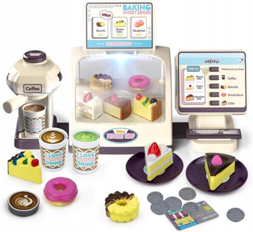 Zestaw zawiera wszystkie elementy, które pozwolą dzieciom wcielić się w sprzedawców kawiarni. Dzieci mogą skanować produkty na kasie fiskalnej, przygotowywać kawę w ekspresie oraz prezentować desery w witrynie chłodniczej. Zabawka wyposażona w realistyczne efekty świetlne i dźwiękowe kasowego aparatu, które sprawiają, że zabawa staje się jeszcze bardziej wciągająca.