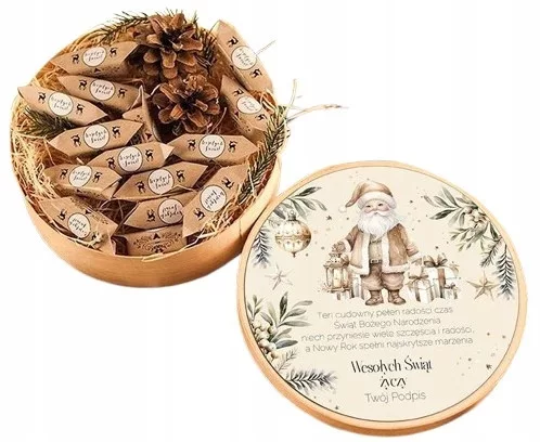 • skład: okrągły kosz prezentowy z naturalnej łuby o średnicy 20cm, w którego skład wchodzi: 18 krówek o śmietankowym smaku z napisem Wesołych Świąt; na wieczku pudełka znajduje się naklejka z dopasowaną grafiką świąteczną, życzeniami i nazwą firmy; w pudełku znajduje się także wypełnienie w postaci wełny drzewnej, gałązek świerku oraz szyszek