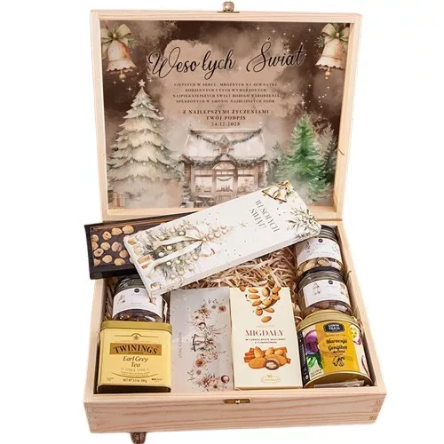 Kosz prezentowy świąteczny umieszczony w skrzyni z naturalnego drewna i przygotowany specjalnie do dzielenia się - wspaniały wybór, jeżeli planujecie wysyłkę prezentów do oddziałów lub biur, w których pracownicy będą mogli dzielić się otrzymanymi dobrociami. W skrzyni znalazły się wysokiej jakości słodycze, a całość pięknie dopełnia karteczka z grafiką, życzeniami i personalizacją.