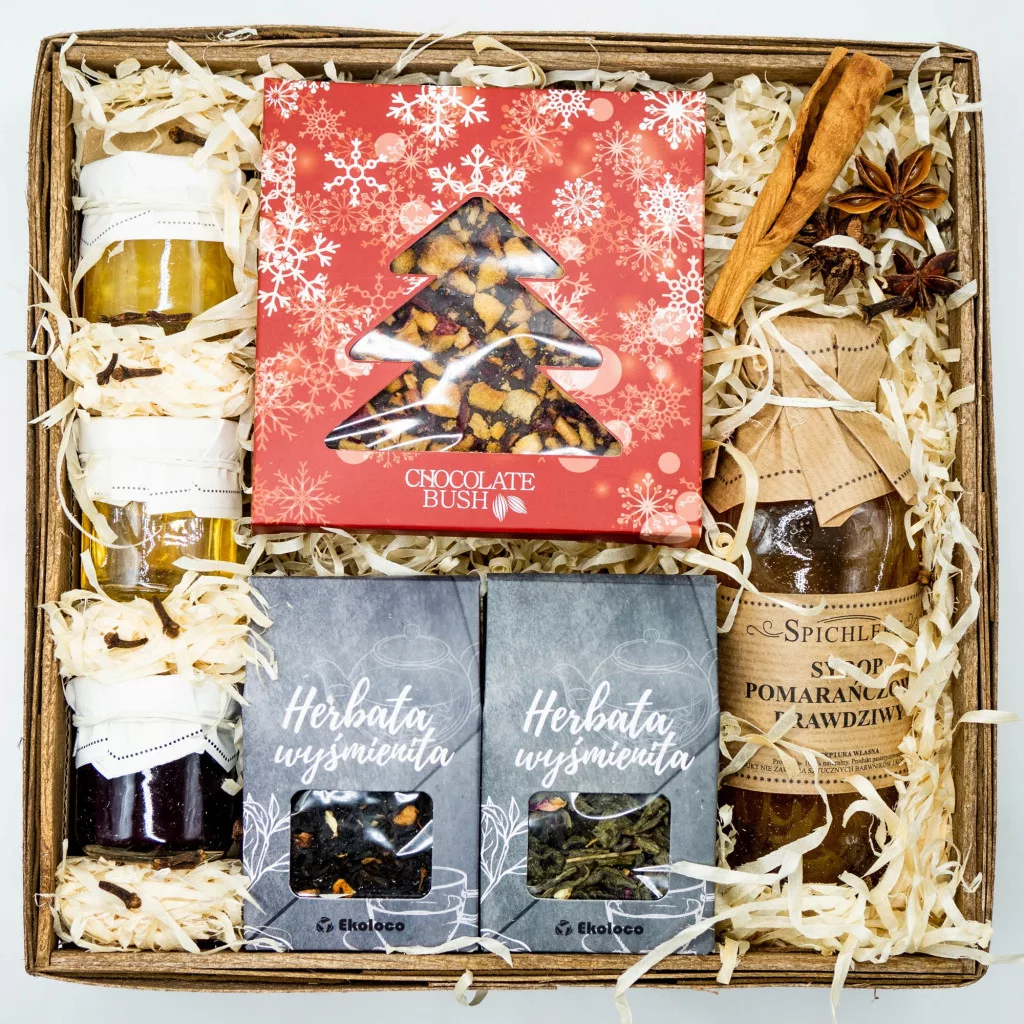 Kosz prezentowy + czekolada świąteczna + herbata + syrop + konfitura + miód