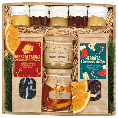 Zestaw ŚWIĄTECZNY Kosz Prezentowy Miodów Herbata Cytrynki NATURALNY