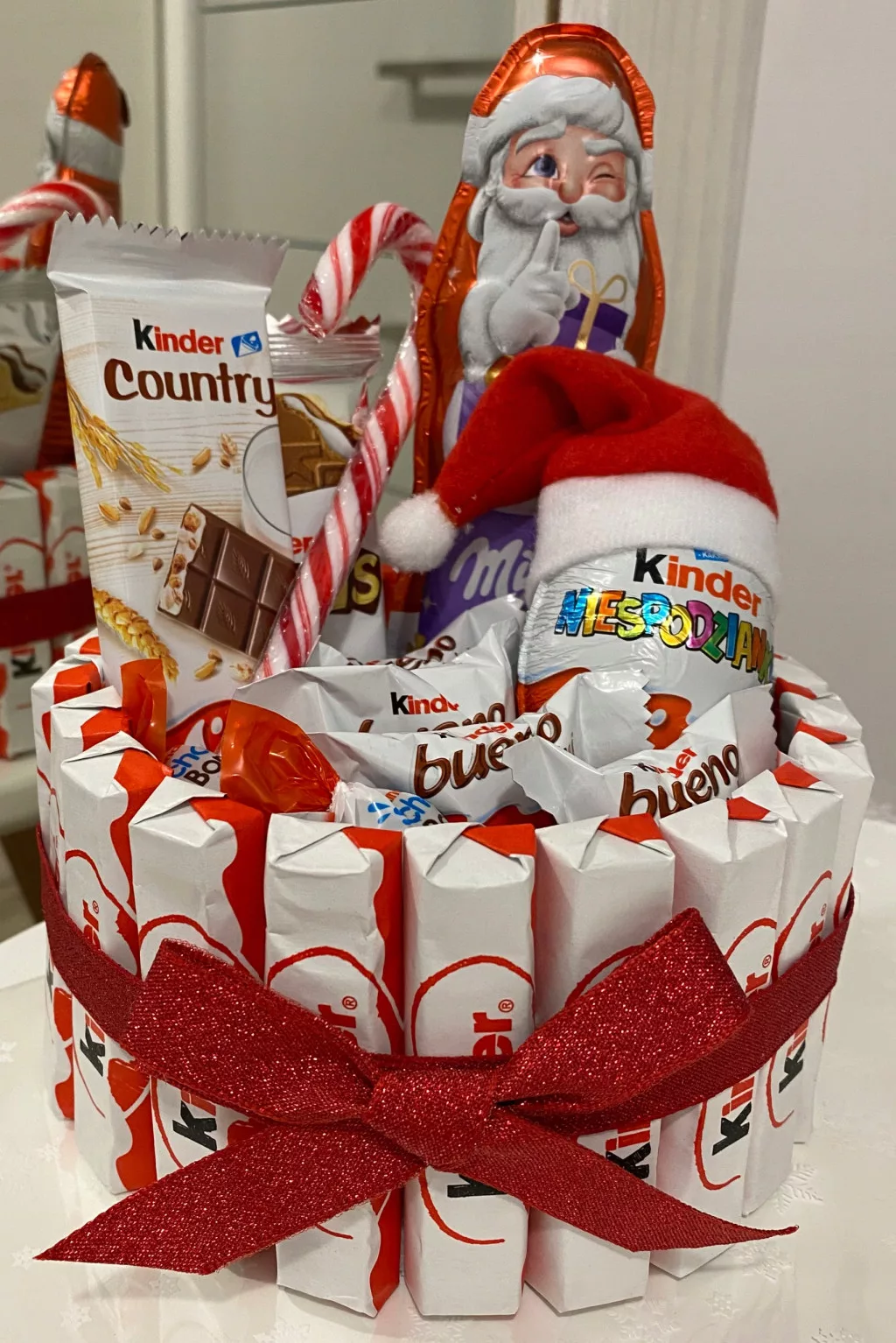 Zestaw zapakowany jest w przezroczystą świąteczną folię celofanową z gwiazdkami, która pięknie błyszczy, a także zabezpiecza słodycze przed uszkodzeniem. Na górze zakończony został wstążką rafią, a czekoladki dodatkowo ozdobione zostały czerwoną brokatową wstążką z kokardą. Nasz zestaw oprócz tradycyjnych słodyczy Kinder i Mikołaja Milka zawiera także dodatkowy akcent świąteczny w postaci słodkiej laski cukrowej oraz ubranego jajka Kinder w czapeczkę Mikołaja.