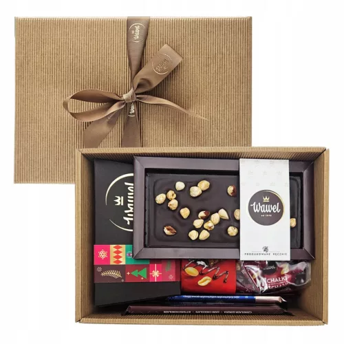 Słodki prezent świąteczny, zamknięty w ekologicznym pudełku przewiązany wstążką. Zestaw prezentowy pełen słodkich wyrobów Wawel. Doskonały wybór na świąteczne upominki pełne smaku i ciepłych życzeń, a także jako słodka paczka na Mikołajki, współpracowników lub klientów!