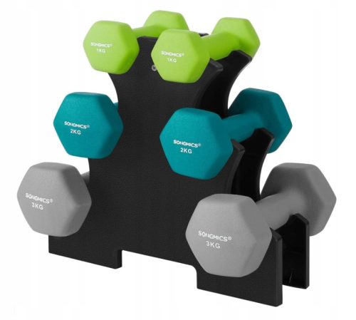 • Co dostajesz: Zestaw 6 hantli - 2 x 1kg (limonkowa zieleń), 2 x 2kg (akwamaryna) i 2 x 3kg (jasnoszary), solidny stojak na hantle i szansa na schudnięcie, zbudowanie siły lub wzmocnienie mięśni w domu