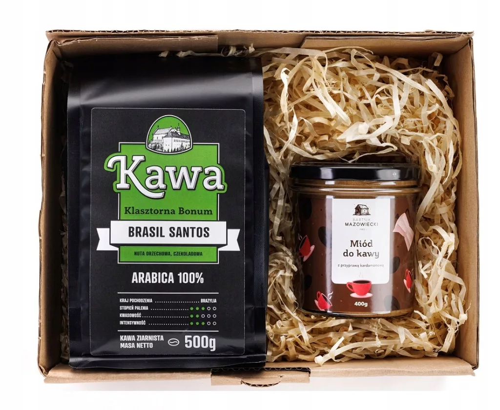 Zestaw upominkowy BONUM Brazylia Santos Kawa ziarnista 500g + Miód do kawy 400g - opis produktu: