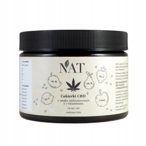 NAT cukierki CBD o wyśmienitym smaku wieloowocowym wzbogacone aż 7 witaminami: witamina C, witamina E, kwas pantotenowy, witamina B2, witamina B1, kwas foliowy, biotyna – bez konserwantów, bez glutenu, z sokami owocowymi.