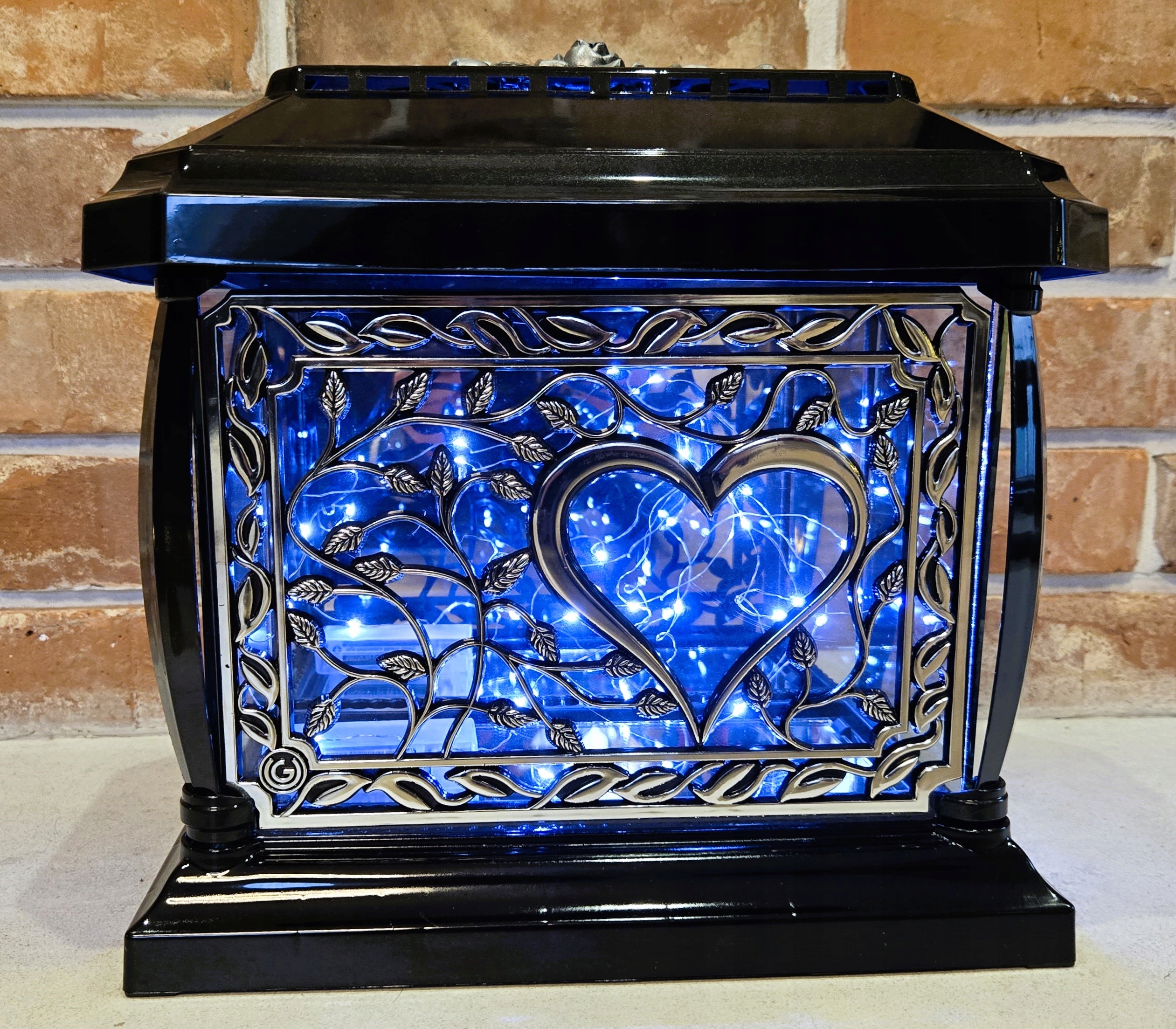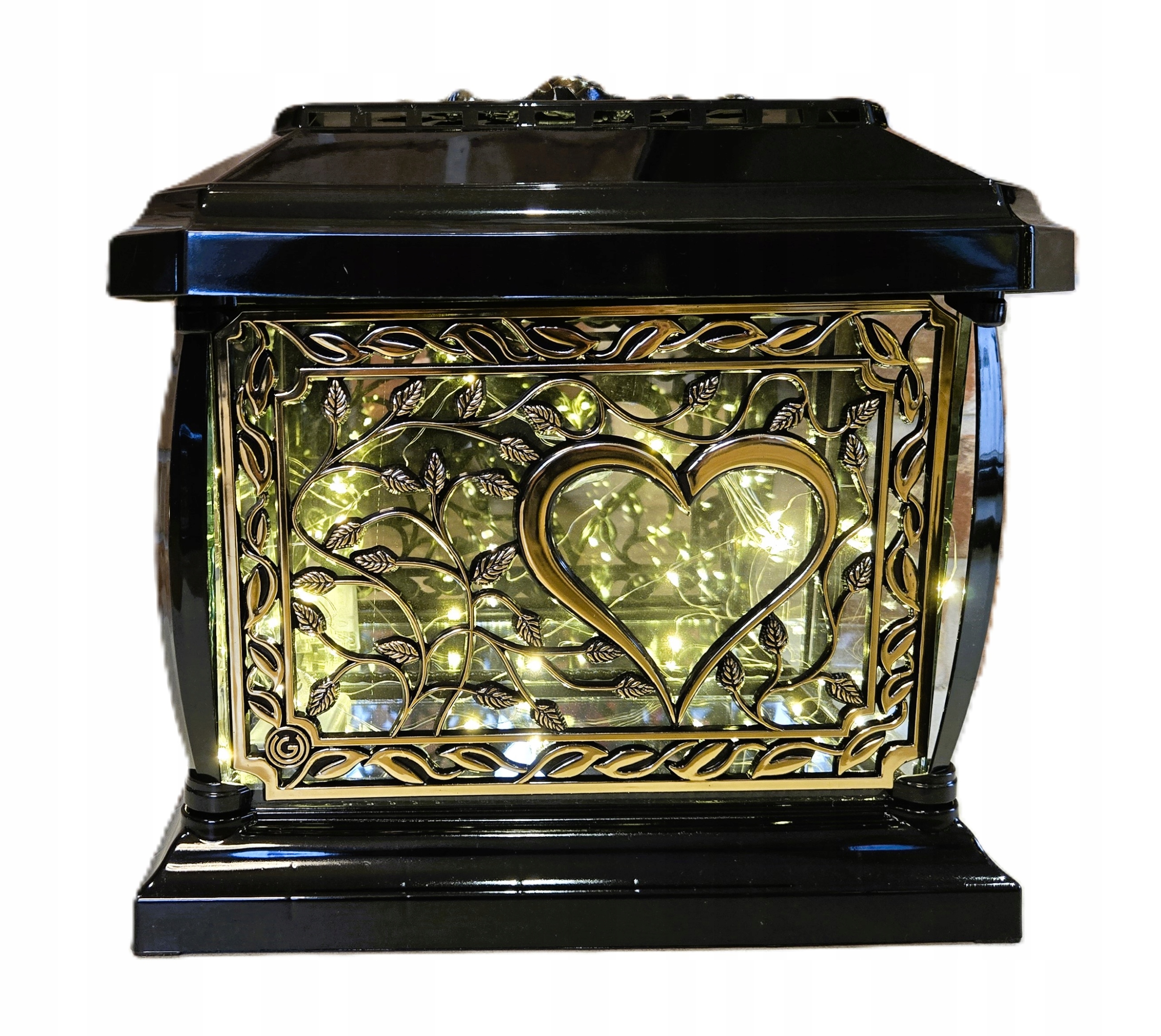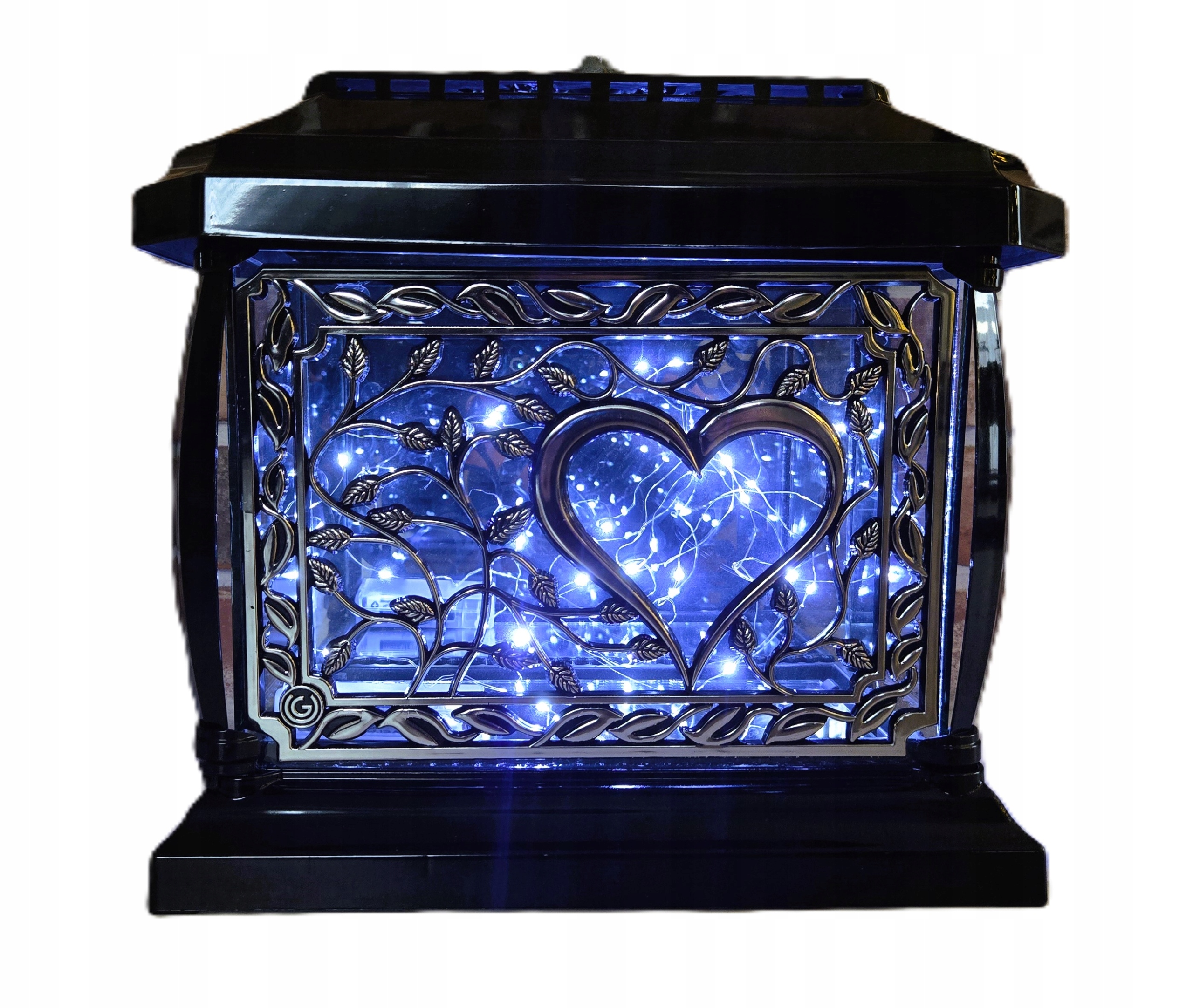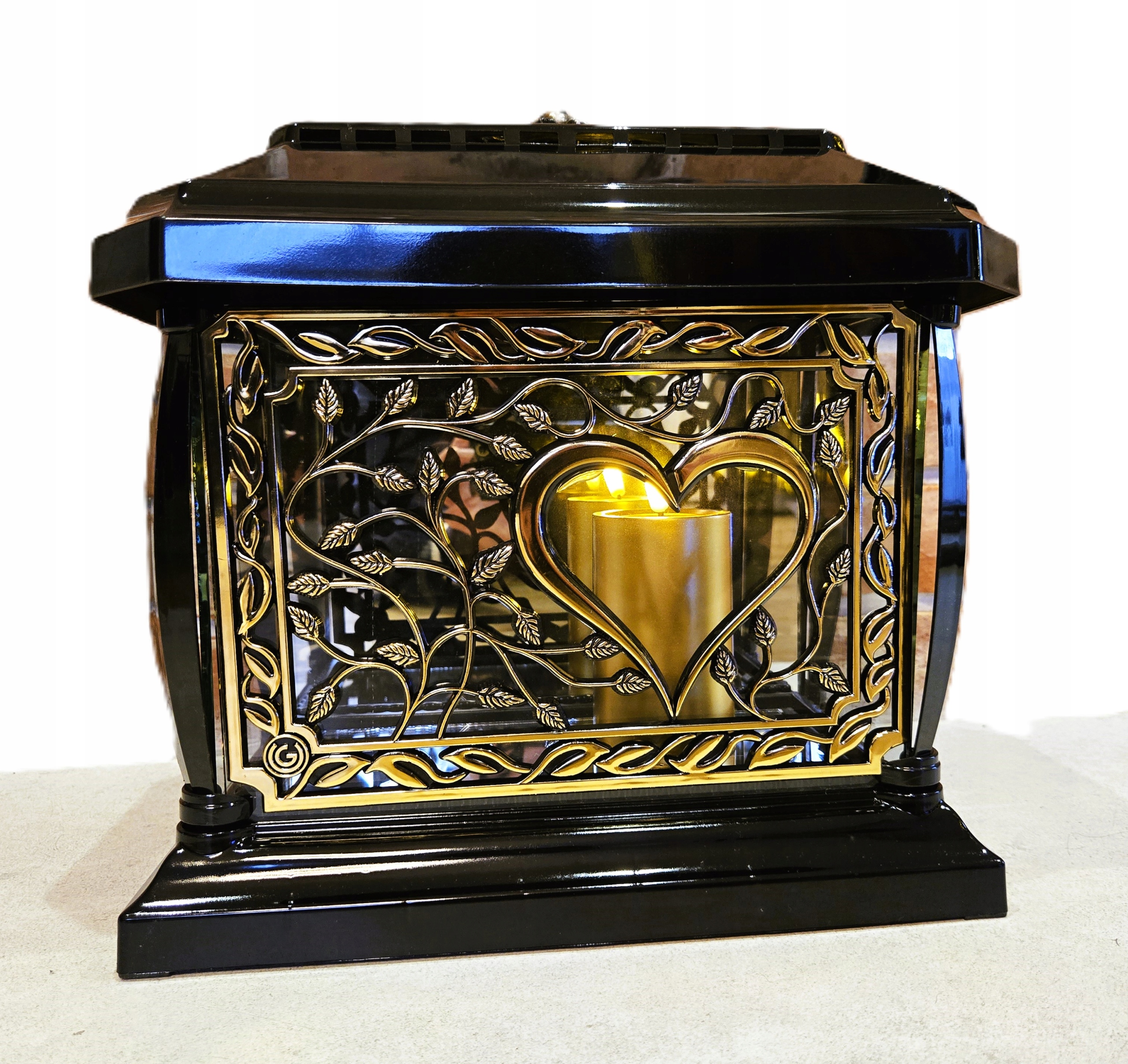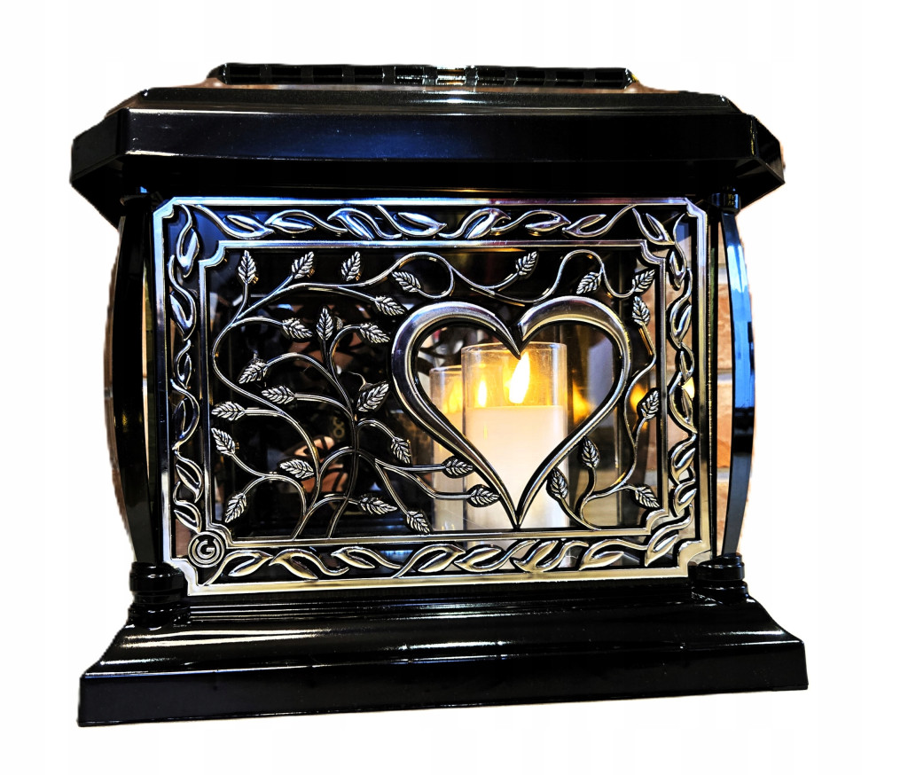 Scopri il Lampione Funerario Panteon, eleganza e rispetto nella commemorazione dei tuoi cari. Questa lanterna nera presenta una raffinata rosa argentata sulla copertura e un cuore in argento sul fronte di vetro. Include superfici specchiate posteriori e inferiori che riflettono la luce delle candele. Realizzato in materiale resistente alle intemperie, con tre pareti in vetro spesso per una durata superiore. Nota: venduto senza inserti di candele; compatibile con inserti paraffinici e candele LED elettriche. Un tributo luminoso e dignitoso per chi ti sta a cuore.