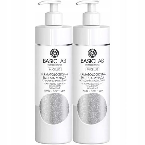 Dermatologiczna Emulsja myjąca BasicLab Micellis Skóra Bardzo Wrażliwa i Delikatna 600ml (2 x 300ml). Wyjątkowo skuteczna kompozycja składników w formie delikatnej emulsji oczyszcza skórę bez podrażnień czy uczucia ściągnięcia. Stworzona  z myślą o skórze wrażliwej i uwrażliwionej oraz podczas kuracji dermatologicznych. Emulsja zapobiega przeznaskórkowej utracie wody i przygotowuje skórę do dalszej pielęgnacji.