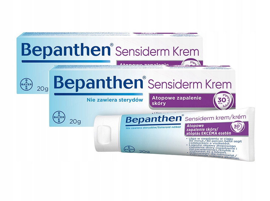 BEPANTHEN Sensiderm krem to preparat o wielokierunkowym działaniu. Przede wszystkim znosi świąd i zaczerwienienie skóry w przebiegu atopowego zapalenia skóry, egzemy czy skórnych reakcji alergicznych. Przywraca zdolność skóry do ochrony organizmu przed czynnikami szkodliwymi. Łagodzi świąd. Bepanthen Sensiderm zapewnia optymalne nawilżenie skóry  oraz pobudza naturalne mechanizmy nawadniania skóry i zapewnia optymalne warunki do naturalnego procesu jej regeneracji.