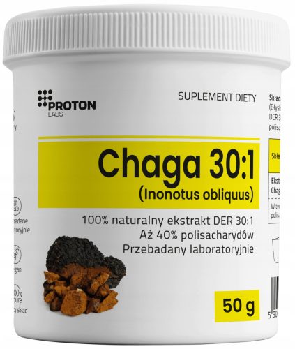 Grzyb Chaga 30:1 od Proton Labs to suplement diety wyprodukowany ze składników najwyższej jakości, pochodzących z naturalnych środowisk występowania Błyskoporka podkorowego. Połączenie wysokiej standaryzacji (40% polisacharydów) oraz wysokiego DER* sprawia, że jest to najlepszy i najmocniejszy ekstrakt z Chaga na polskim rynku!