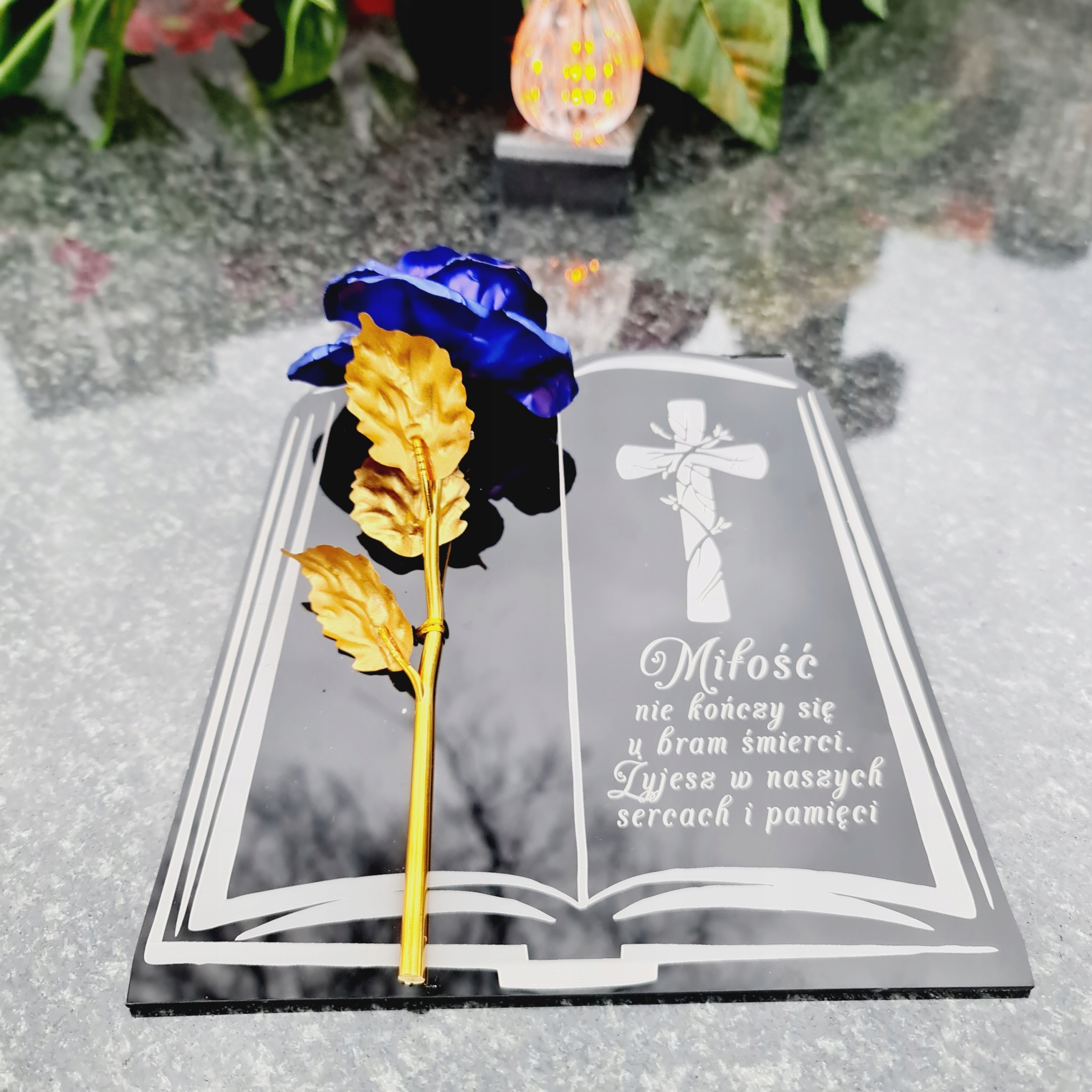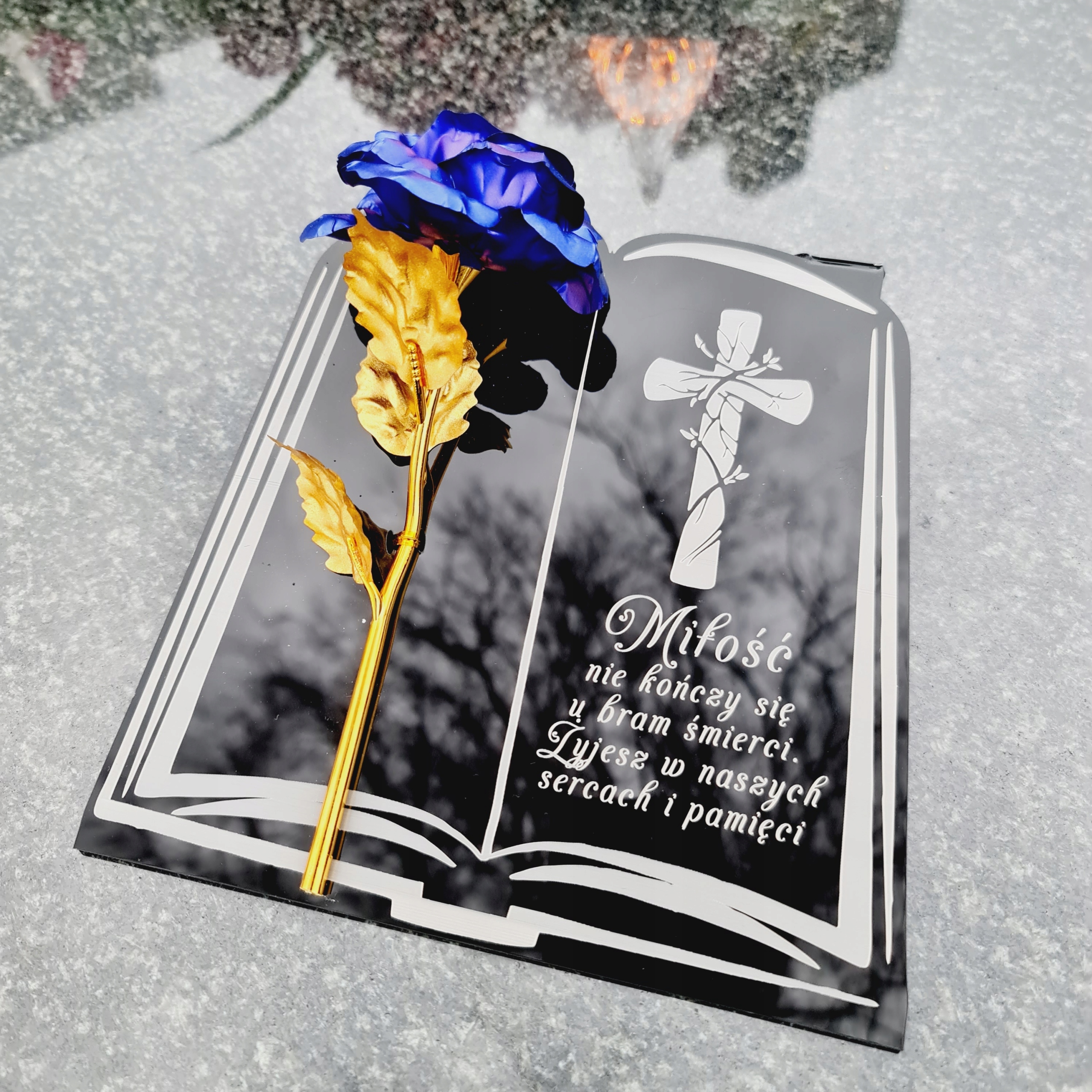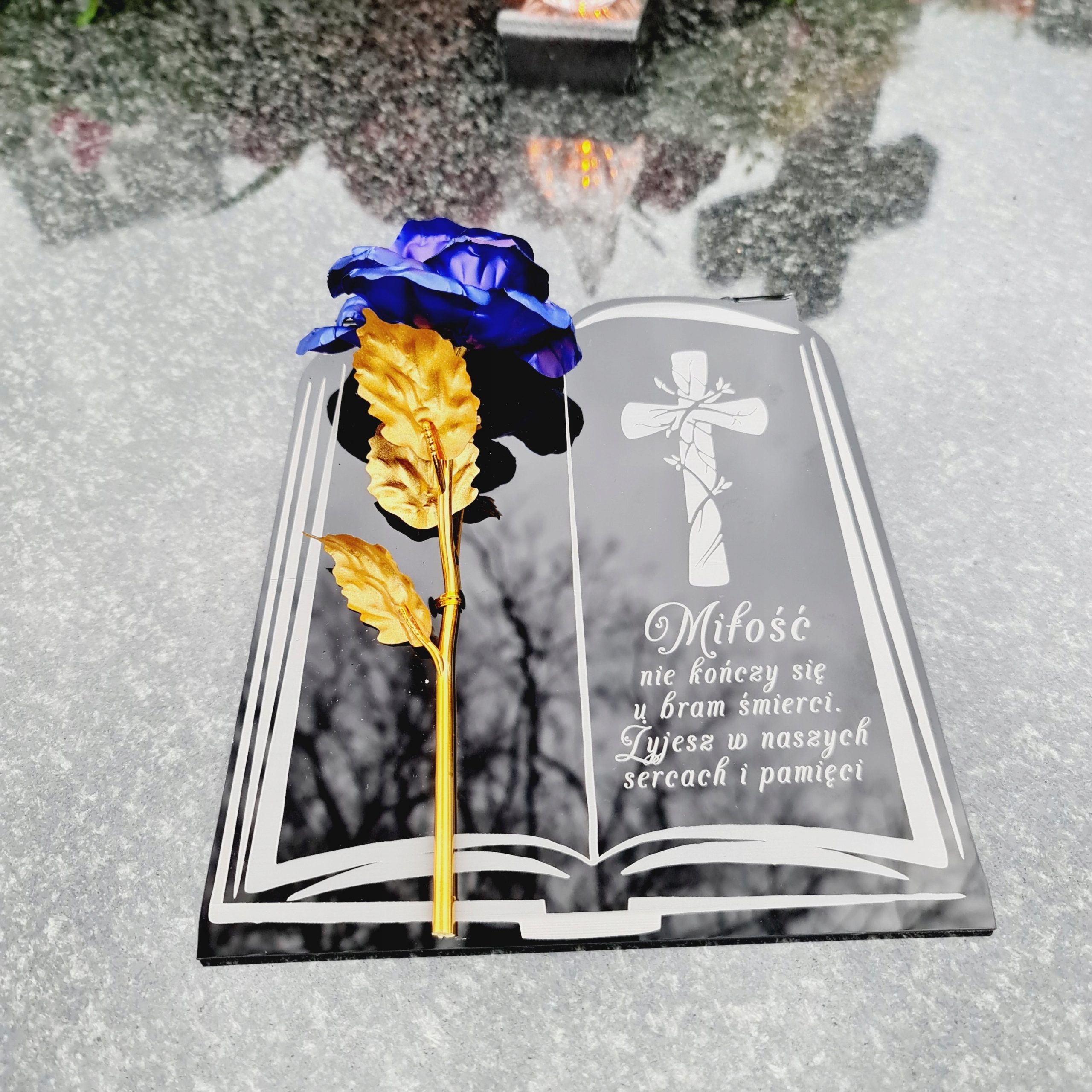 Postument został wykonany ze szkła akrylowego, ozdobiony metaliczną wieczną różą.