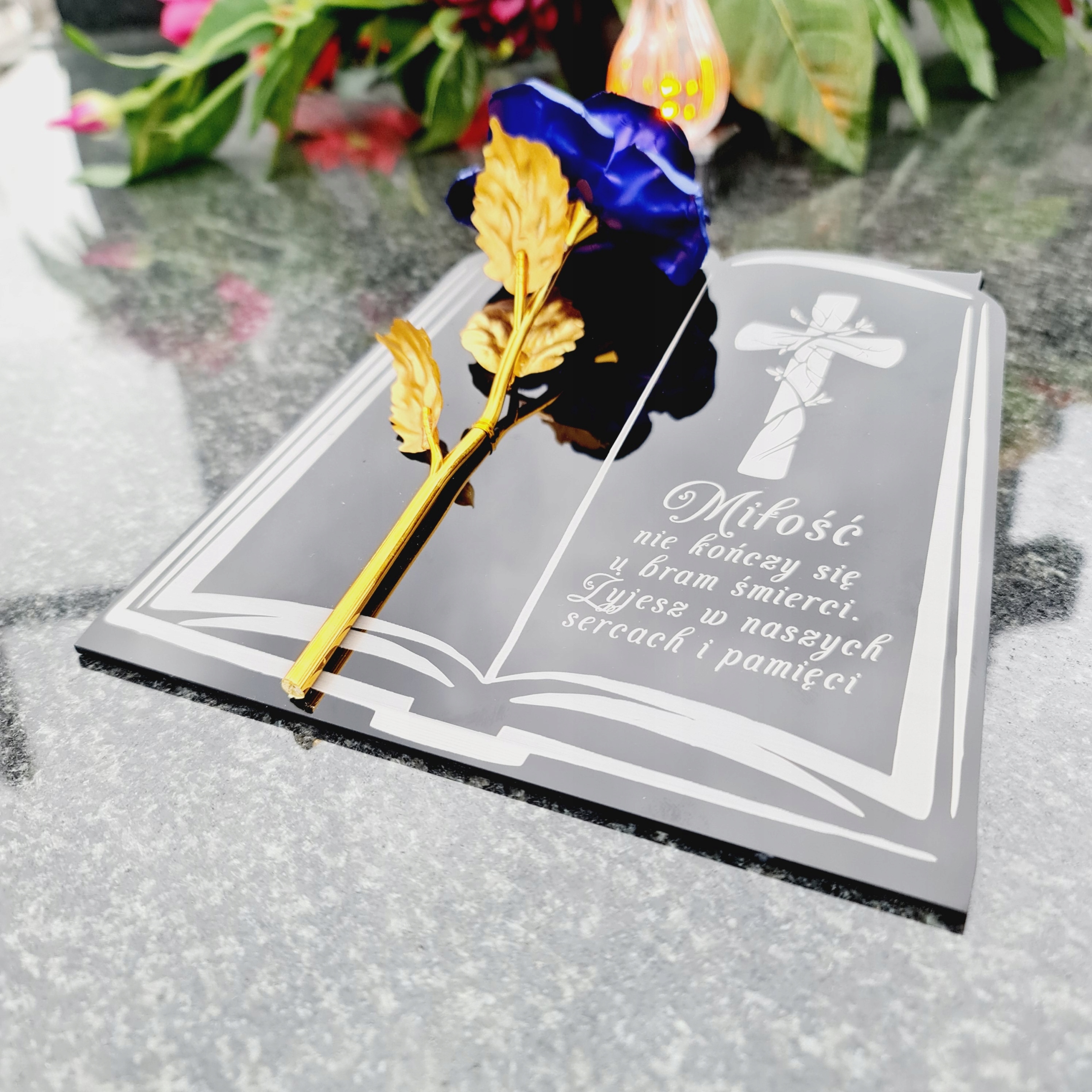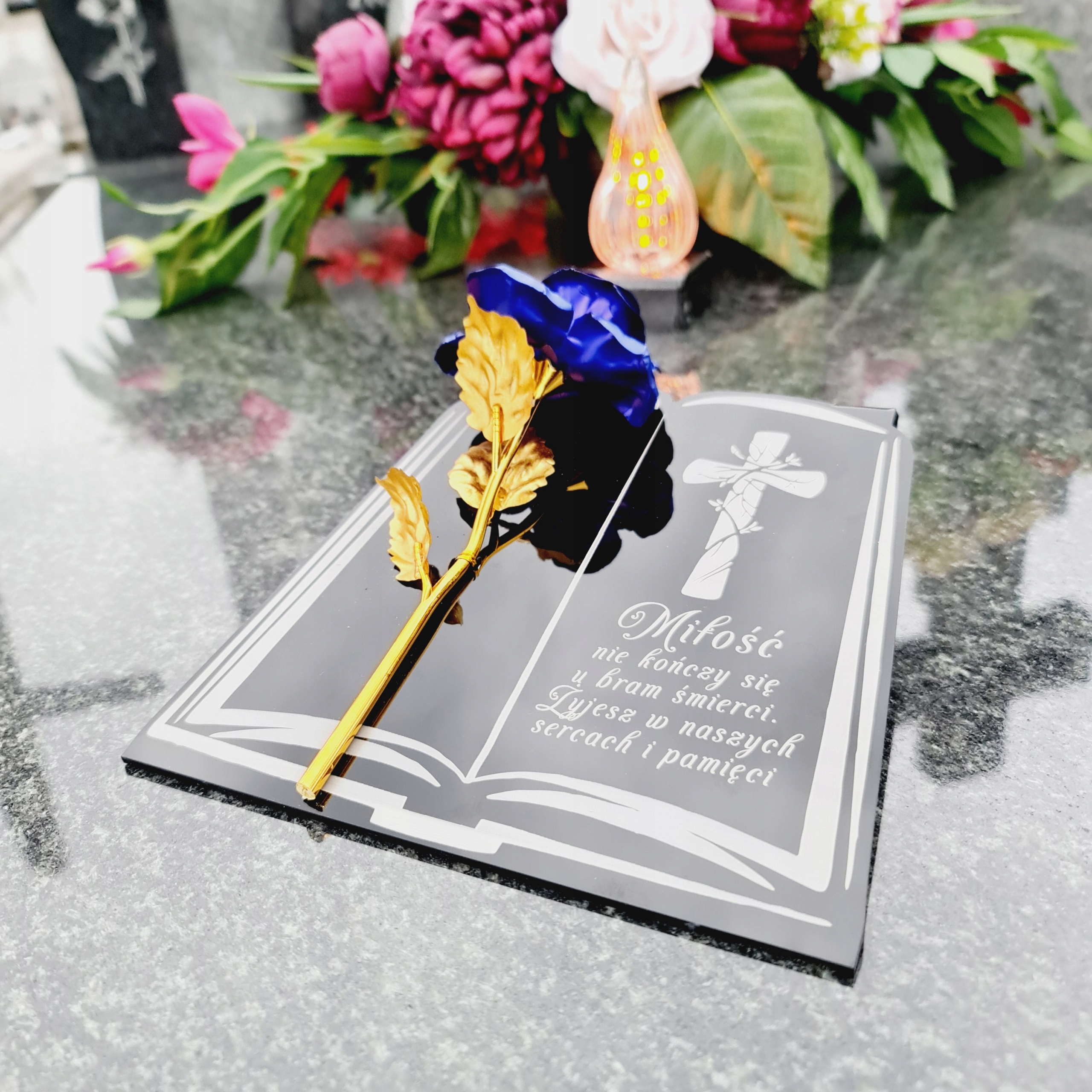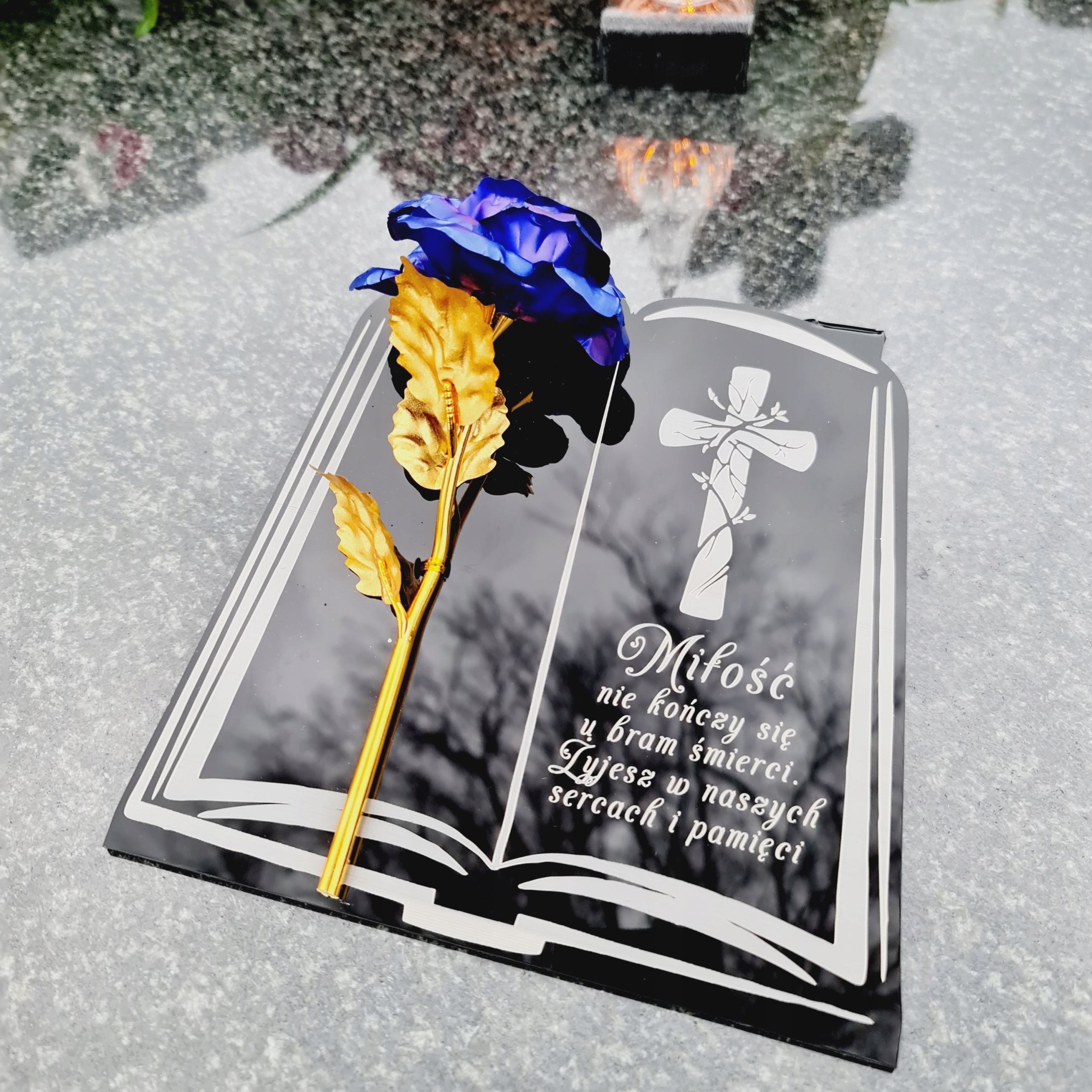 Postument został wykonany ze szkła akrylowego, ozdobiony metaliczną wieczną różą.