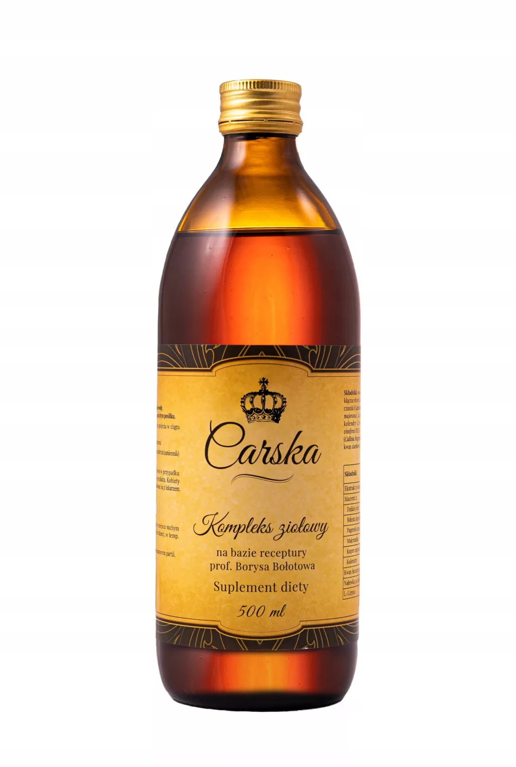 Suplement diety Carska – produkt, który Państwu oferujemy, oparty jest właśnie na bazie tej pierwotnej, wieloskładnikowej receptury. Jest jedynym na rynku suplementem bazującym na oryginalnym składzie „Wódki Carskiej” oraz procesie produkcji opartym na wielotygodniowej maceracji. Jej obecna receptura jest wynikiem wieloletnich badań oraz testów i została opracowana oraz skalibrowana wiele lat temu przez polskiego naturopatę współpracującego z naszą firmą. Zastosowaliśmy również kwas bursztynowy, który dodany w odpowiedniej proporcji – wg prof. Bołotowa – zwiększa jego efektywność.
