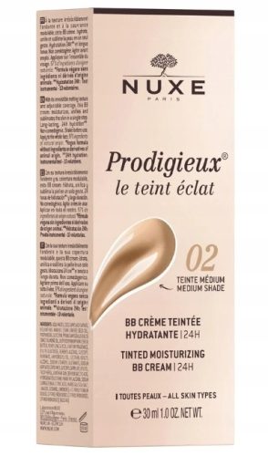 Krem BB do twarzy, kolor średni 02 Nuxe Prodigieux przeciw niedoskonałościom nawilża, ujednolica koloryt i upiększa skórę do 24 godzin. Lekka formuła kosmetyku idealnie rozpływa się na skórze, zapewniając natychmiastowy efekt świeżej, miękkiej i promiennej cery. Biometryczna tekstura kremu stapia się ze skórą dzięki zawartości pigmentów pochodzenia naturalnego. Produkt nie zawiera silikonu. Jest niekomedogenny.