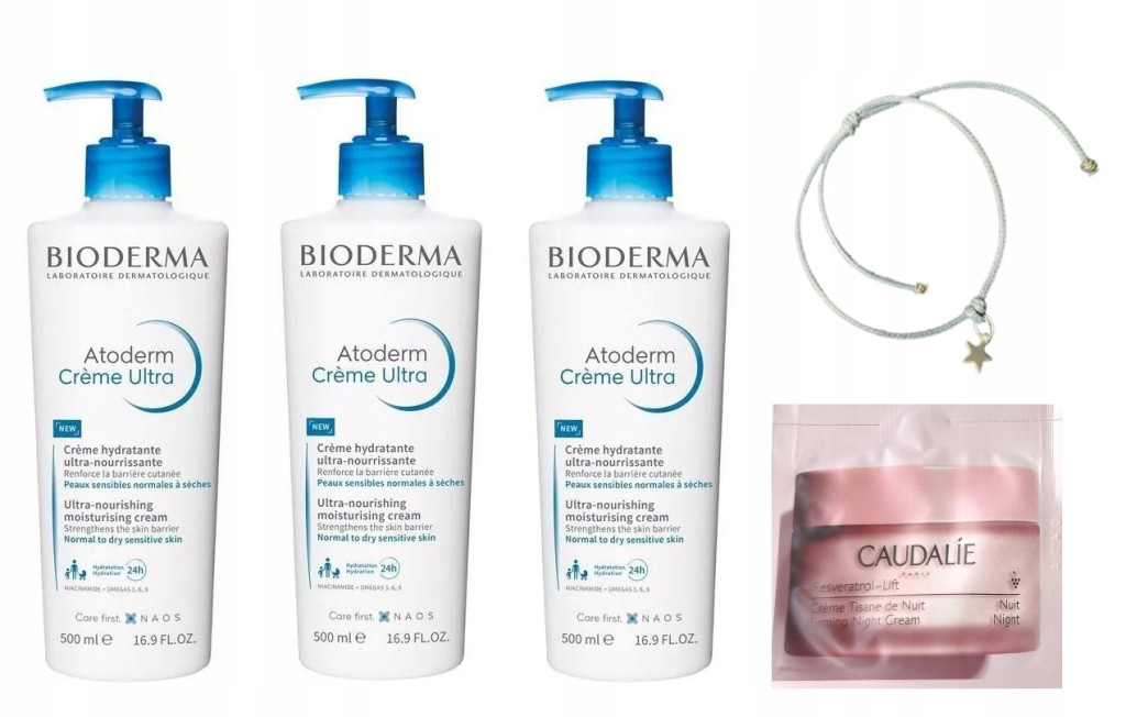 Scopri il kit esclusivo Bioderma Atoderm Creme Ultra, perfetto per la cura della pelle secca e sensibile. Questo ricco set comprende tre flaconi da 500 ml della crema ultra idratante e ristrutturante Bioderma Atoderm, arricchita con nutrienti che rinforzano la barriera cutanea, prevenendo secchezza e irritazioni. La pelle diventa morbida, liscia ed elastica. In aggiunta, riceverai gratuitamente un set di campioni di prodotti Caudalie (1-7 ml) e una elegante braccialetto 'Bransoletka Gwiazdka'. È l'ideale per testare i cosmetici di lusso e aggiungere un tocco di stile al tuo look. Non perdere l'occasione di coccolare la tua pelle con il massimo della cura quotidiana raccomandata dai dermatologi. Acquista ora per un'esperienza di bellezza completa e raffinata.