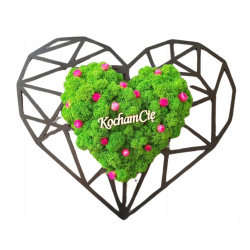 Doskonale prezentuje się w salonie, sypialni czy na honorowym miejscu w kuchni. Jasna zieleń mchu i subtelna forma serca przyciągają wzrok i ocieplają przestrzeń.