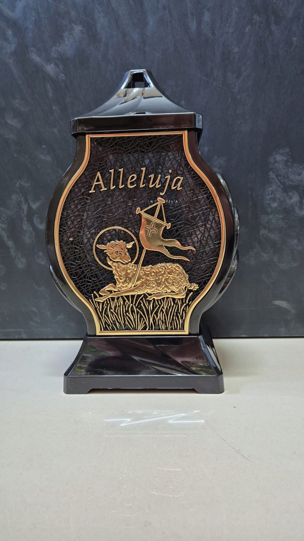 Znicz Vetro Nero "Alleluja" 30cm con Agnello Pasquale Dorato - Elegante e Raffinato