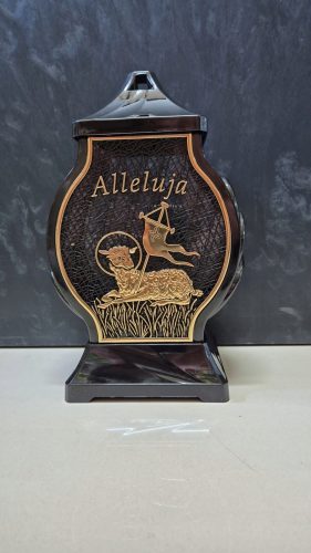 Piękny i elegancki znicz szklany czarny "Alleluja" z motywem złotego Baranka Wielkanocnego to wyjątkowa dekoracja nagrobna, idealna na święta wielkanocne. Wykonany z wysokiej jakości szkła i tworzywa sztucznego, prezentuje się niezwykle stylowo i trwałe.