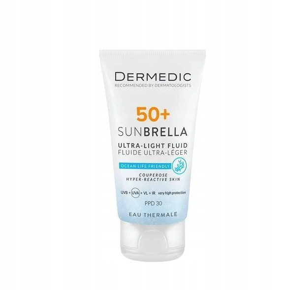 SUNBRELLA Ultralekki krem SPF 50+ stworzony specjalnie dla skóry naczyniowej i nadreaktywnej. Ten delikatny krem zapewnia skuteczną ochronę przed szkodliwym promieniowaniem UVA, UVB, VL i IR, jednocześnie wzmacniając naczynia krwionośne i redukując rumień. Dzięki fotostabilnym filtrom SPF 50+ chroni skórę wrażliwą przed negatywnymi skutkami działania promieni słonecznych.