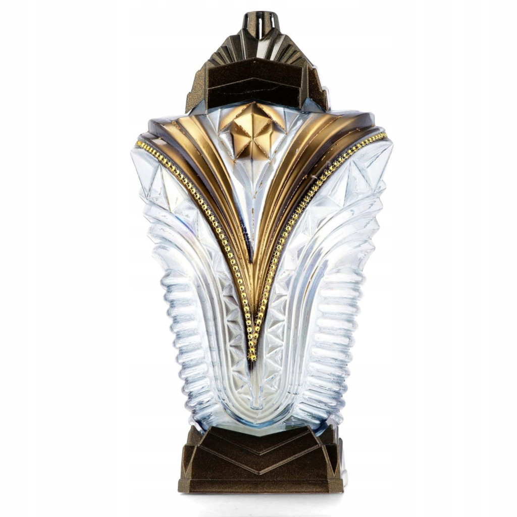 Szklany korpus znicza ma charakterystyczny, majestatyczny kształt, przypominający starożytne artefakty. Front zdobią bogate, geometryczne ornamenty. Centralny element to pionowy złoty pas, który rozchodzi się ku górze, tworząc literę "V". Pas ten ozdobiony jest małymi, błyszczącymi cyrkoniami, dodającymi elegancji i blasku. Po bokach złotego pasa znajdują się wypukłe, geometryczne wzory, które podkreślają trójwymiarowy efekt. Górną część frontu zdobią stylowe wzory rombów i trójkątów, pomalowane złotą farbą z metalicznym połyskiem.