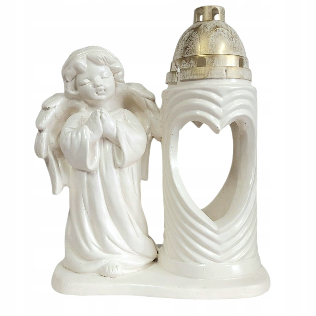 Znicz Gipsowy Biało - Złoty w Kształcie Serca z Figurką Anioła - 32 cm