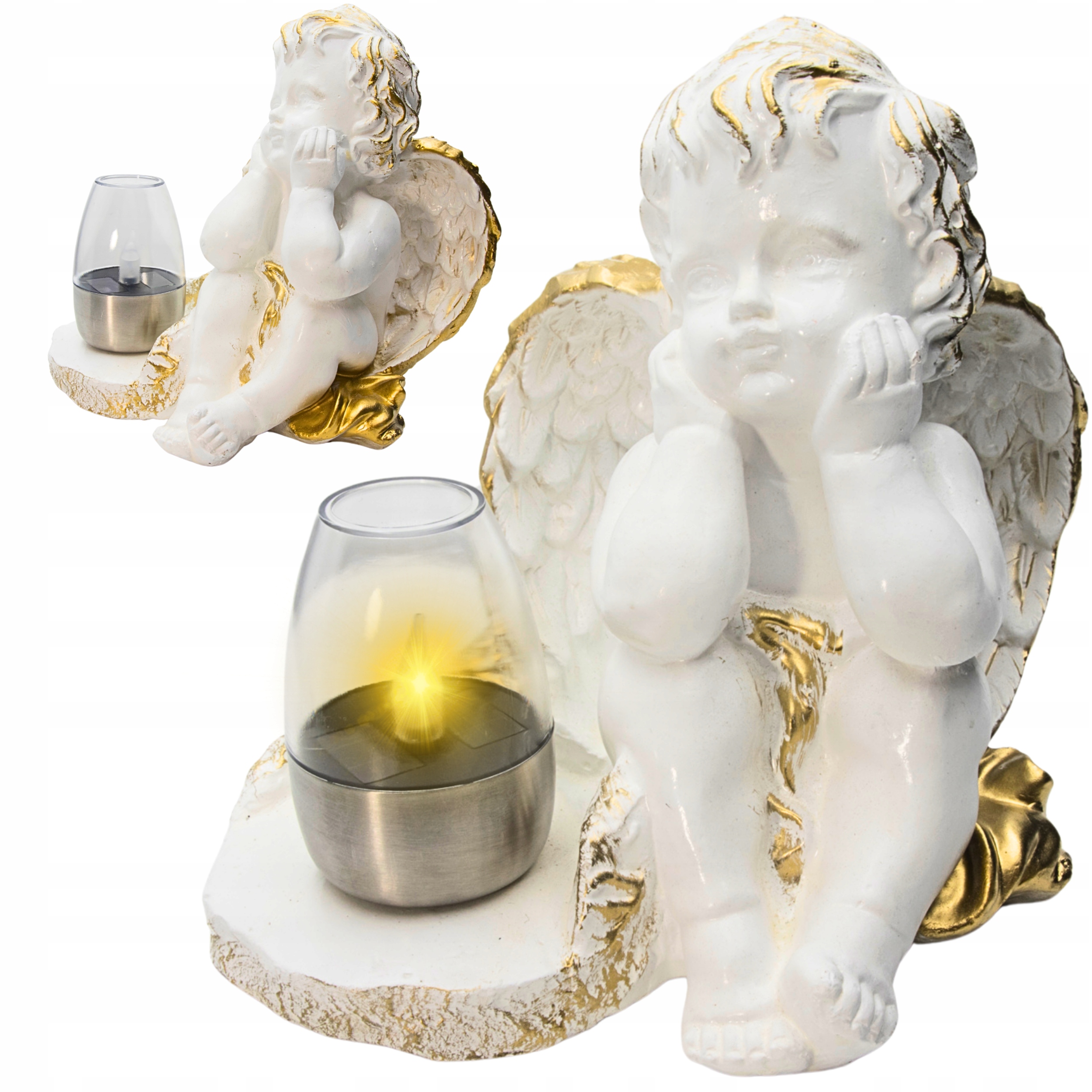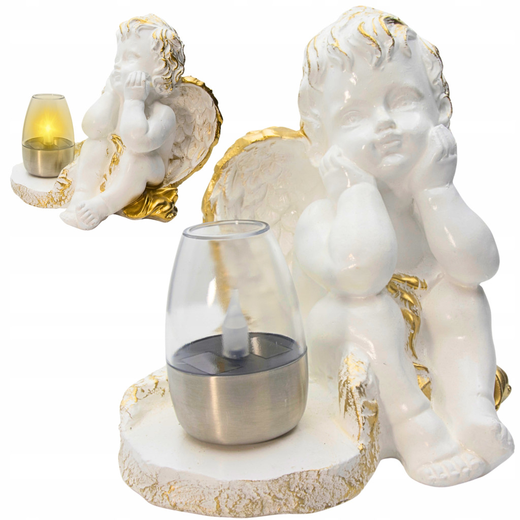 Znicz figurka nagrobna – biało-złoty aniołek w zadumie + solarna lampka LED