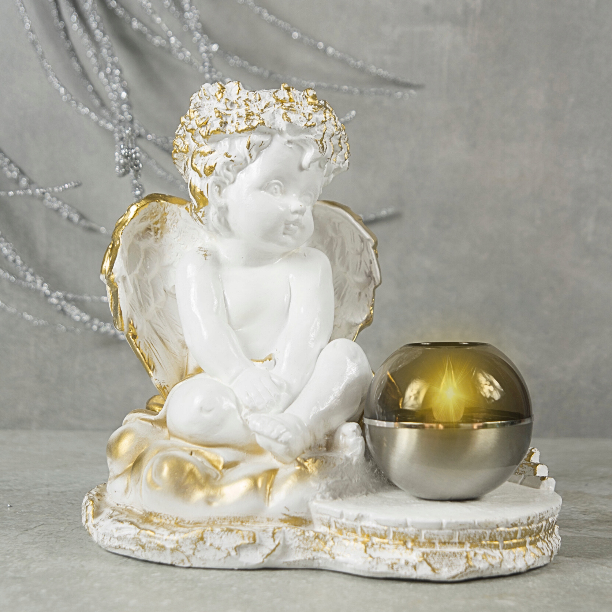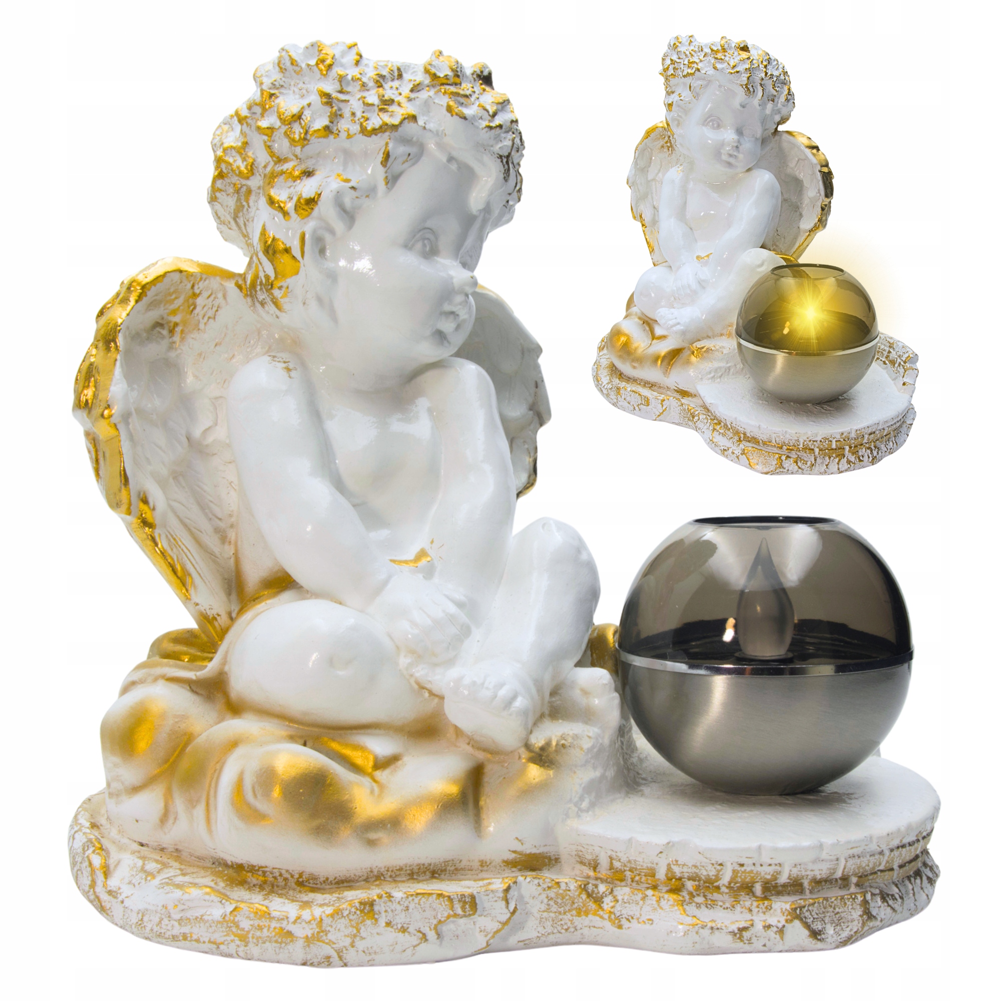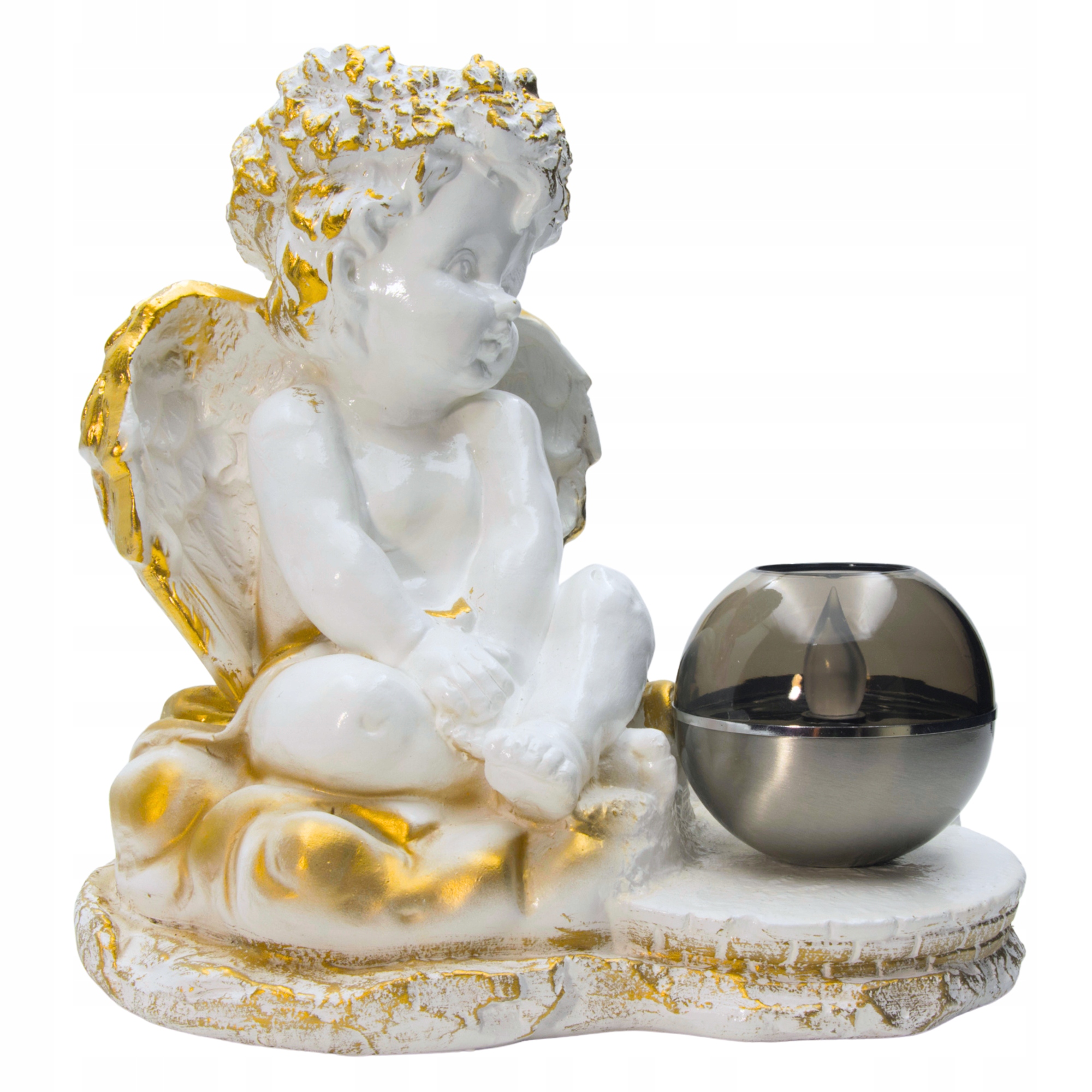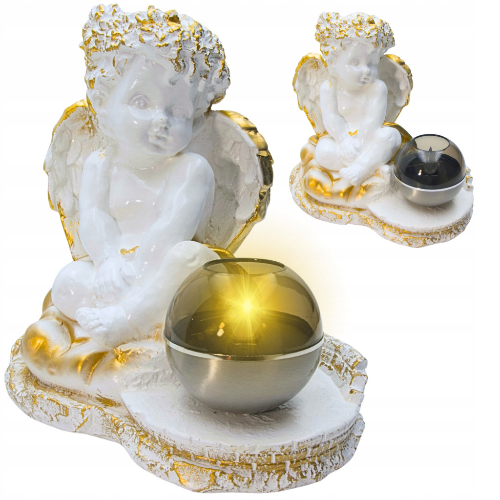 ???? Figurka aniołka z kulą solarną LED – złote zdobienia