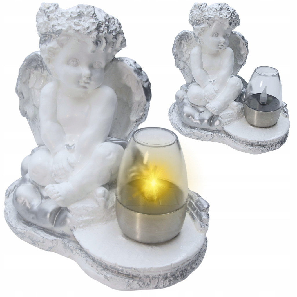 Elegancka figurka aniołka siedzącego na dekoracyjnej podstawie to wyjątkowy symbol pamięci i duchowej opieki. Wykonana z impregnowanego gipsu, dzięki czemu jest odporna na deszcz, mróz i słońce – zachowa swój blask przez długi czas. Subtelne srebrne zdobienia dodają prestiżu, a lampka solarna imituje delikatny płomień, tworząc nastrojowe światło po zmroku.
