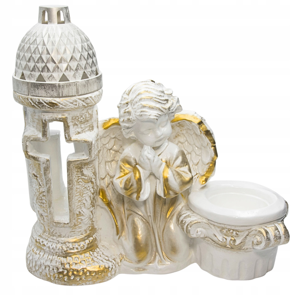 Elegancka figurka anioła w modlitewnej pozie, połączona z latarnią oraz donicą na kwiaty. Złote zdobienia podkreślają wyjątkowy charakter dekoracji, czyniąc ją pięknym symbolem pamięci i czuwania. To idealne połączenie estetyki i funkcjonalności – w jednej formie zyskujesz latarnię na wkład oraz miejsce na kwiaty.