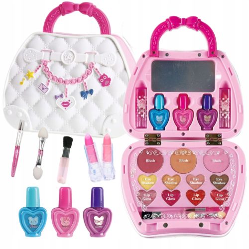 Zestaw kosmetyków dla dzieci w pudełku w kształcie torebki to zbiór pięknych kolorów i akcesoriów, które pozwalają dzieciom eksperymentować i tworzyć piękne stylizacje.
