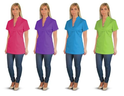 Góra fartucha elegancko wykończona jest stójką. Krótki rękaw sprawia, że fartuch nie ogranicza ruchów i jest bardzo wygodny.
