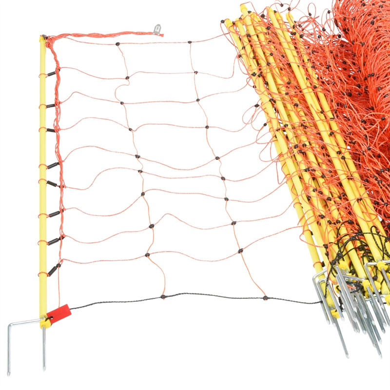 Siatka do ogrodzenia elektrycznego idealnie nadaje się do wyznaczenia obszaru wypasu dla kóz lub owiec. Ogrodzenie z siatki elektrycznej można dowolnie przenosić, kiedy chcemy zmienić obszar wypasu. Przedstawiona siatka może również służyć jako ochrona przed większymi szkodnikami takimi jaki lisy, sarny. Produkt niemiecki, duża trwałość, wysoka jakość wykonania Przewody i paliki w kolorze pomarańczowym (14 palików) Poziome linki z wplecionymi drucikami chromowo niklowymi przewodzącymi prąd. Linki poziome połączone plombami z linkami pionowymi, stabilizującymi konstrukcję siatki.