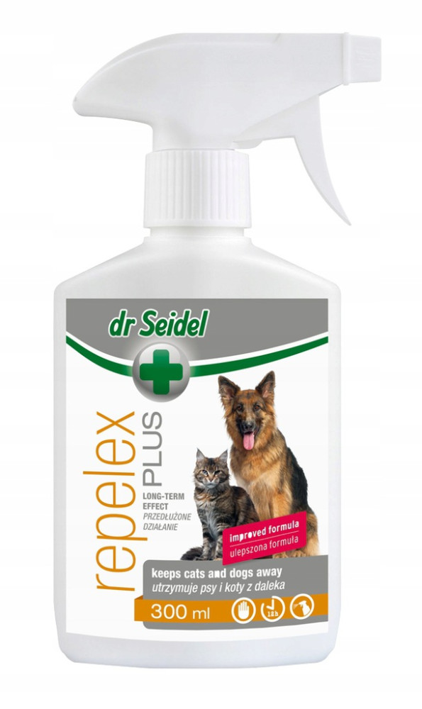 Preparat dr Seidel Repelex Plus to płyn o przedłużonym działaniu stanowiący pomoc behawioralną, a wiec pomaga oduczyć zwierzę niepożądanych zachowań takich jak: załatwianie potrzeb fizjologicznych w miejscach do tego nieprzeznaczonych, niszczenie przedmiotów, drapanie, gryzienie. Zawarte w nim substancje zapachowe odbierane są przez psy i koty jako bardzo nieprzyjemne. Dzięki temu spryskane powierzchnie i przedmioty przestają być obiektem zainteresowania zwierzęcia. Nieszkodliwy dla ludzi i zwierząt. Ma świeży cytrynowy zapach.