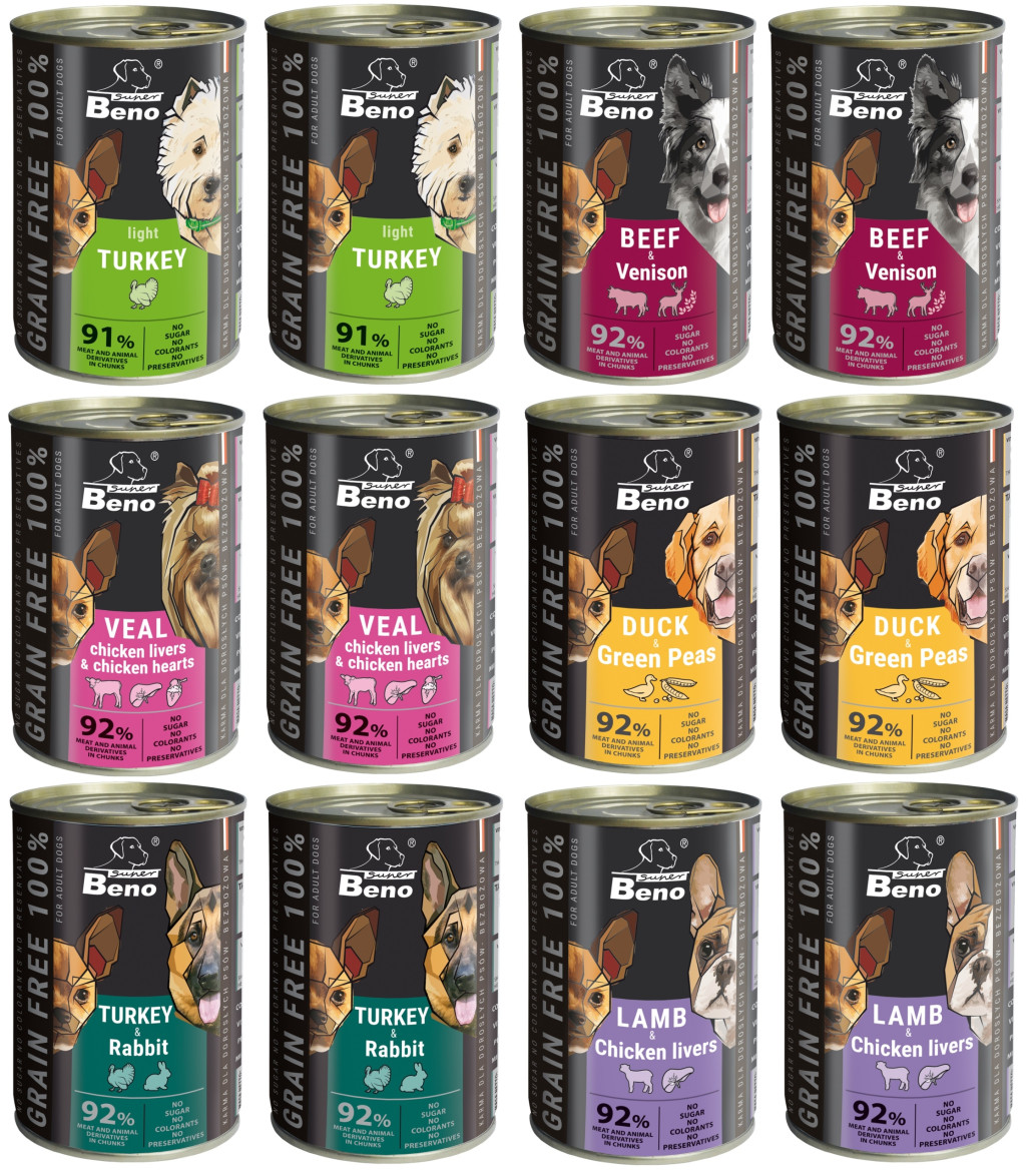 Beno Cibo umido per cani senza cereali MIX 12x 415g Cani in scatola 92% carne
