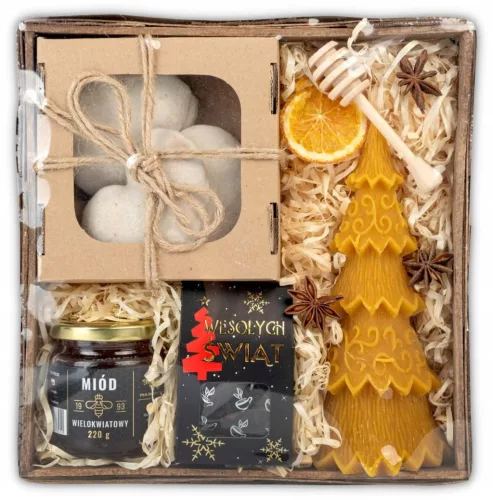 Prezent nie musi być nudny! Dlatego włożyliśmy do pudełka miodowe przetwory, herbatę oraz pierniki, które są naprawdę przepyszne.